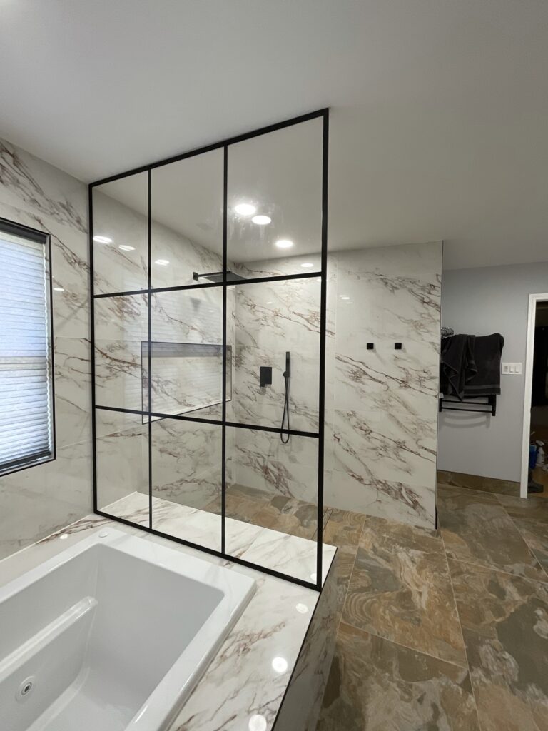 Get the industrial metal grid look with the ease of digital print which is easier to clean & maintain but still gives that trending now look of the metal grid shower.