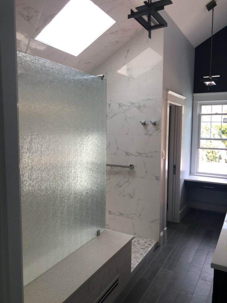 Tile viewed through low iron glass will be true to color without the obstruction of a greenish hue that naturally occurs in standard glass. It is also the best option for white bathroom décor and white tile because the glass is neutral in color providing the clearest option available.